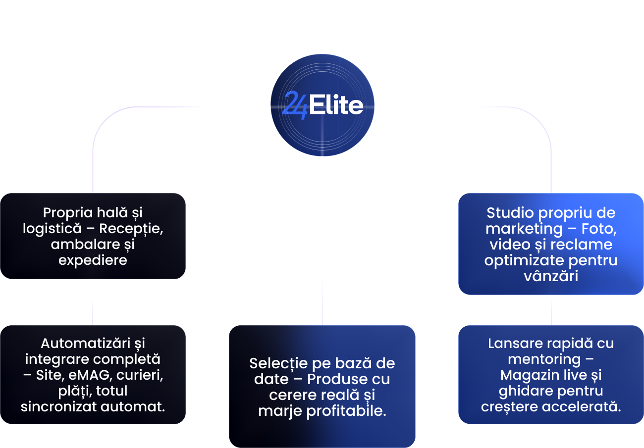 Programul 24Elite îți oferă un pachet complet: site, produse, marketing, depozitare și procesarea comenzilor